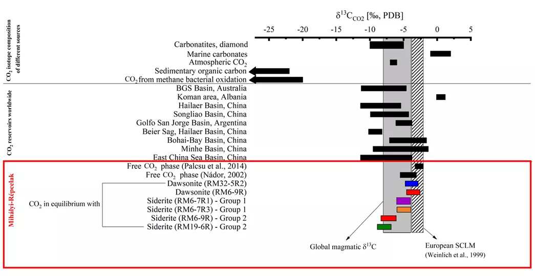 Figure 3: Carbon isotope composition of CO2 in equilibrium with carbonate minerals in the Mihályi-Répcelak reservoir (Cseresznyés et al., 2021)