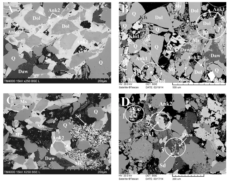 Figure 2: Scattered electron image of sandstone containing dawsonite in the Mihályi-Répcelak area: Daw = dawsonite, Ank = anchorite, Q = quartz, Ms = muscovite, Dol = dolomite, Kln = kaolinite, Sd = siderite (Cseresznyés et al., 2021)