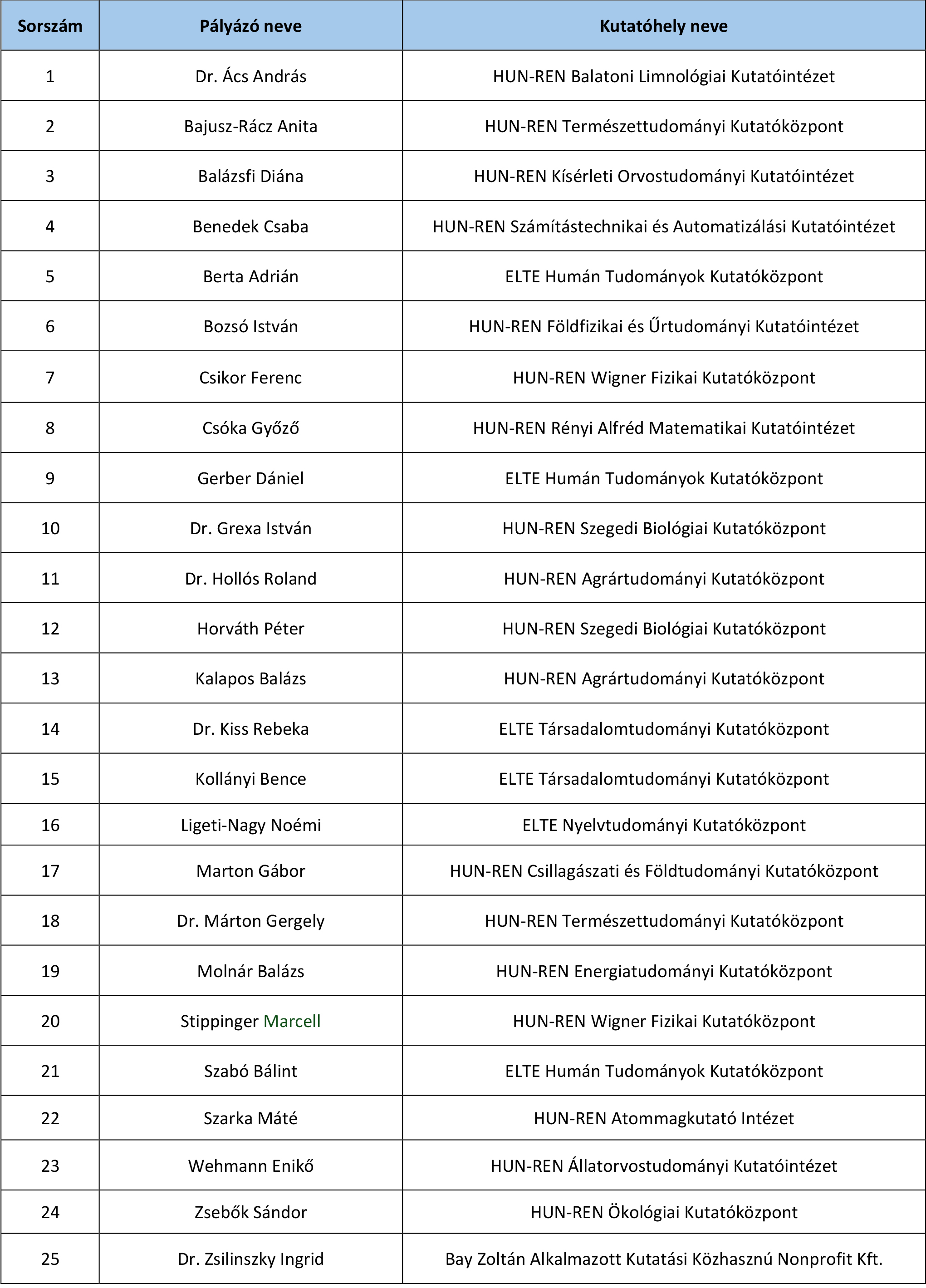 A beérkezett támogatási kérelmek szakmai elbírálása két lépcsőben zajlott: A 2025. augusztus 25-i pályázati határidőre benyújtott és a formai ellenőrzési kritériumoknak megfelelt pályázatotokat először három szakértő értékelte, majd a MI Akciócsoport tagjai rangsorolták azokat a pályázók szakmai alkalmasságának, kapcsolódó tapasztalatának, valamint szakmai elképzelésük figyelembevételével. Az MI Akciócsoport ajánlása alapján a HUN-REN Központ vezérigazgatója 25 pályázat támogatásáról döntött, szem előtt tartva az egyes intézmények képviseletében megpályázható nagyköveti pozíciók lehetséges számát.