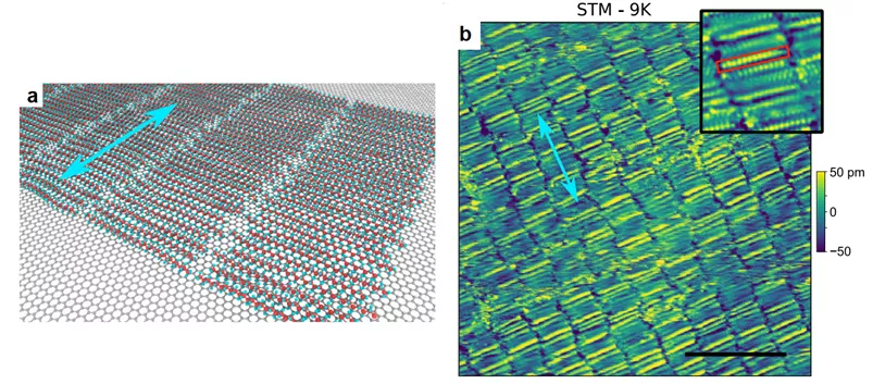 Grafén felületén kialakuló, 20-26 szénatomos alkánláncokból felépülő önszerveződött molekularéteg szerkezeti modellje (a) és atomi felbontású STM-képe (b)